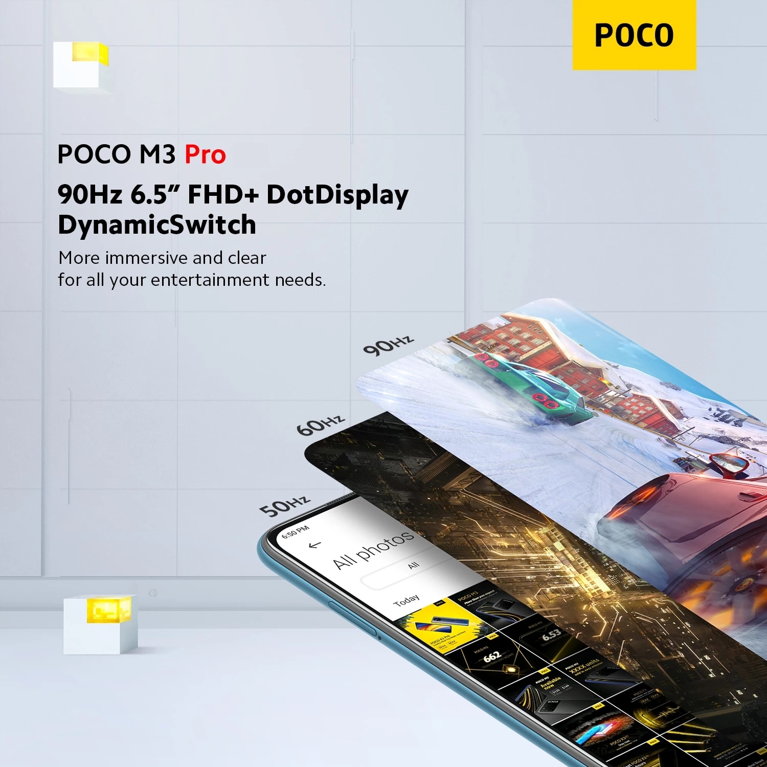 POCO M3 Pro 5G's display can adapt to 90Hz, 60Hz, 50Hz and 30Hz automatically to suit the content you are viewing for