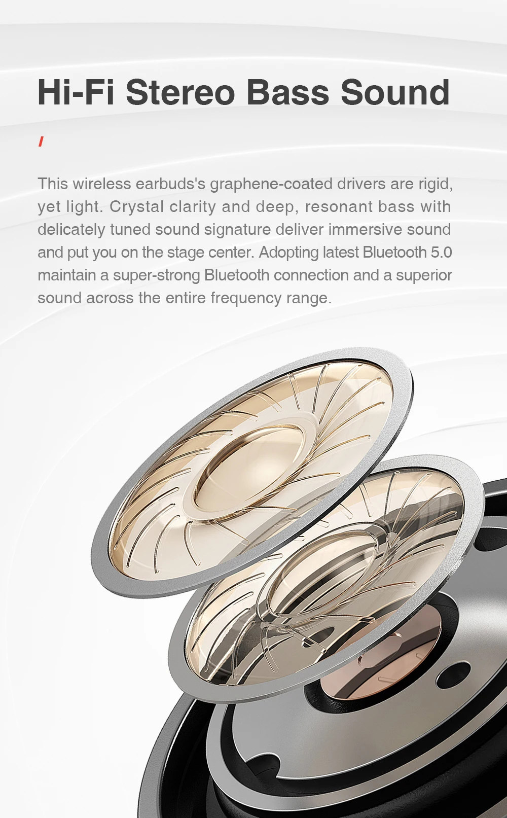This wireless earbuds’s graphene-coated drivers are rigid, yet light. Crystal clarity and deep, resonant bass with delicately tuned sound signature deliver immersive sound and put you on the stage center. Adopting latest Bluetooth 5.0 maintain a super-strong Bluetooth connection and a superior sound across the entire frequency range.