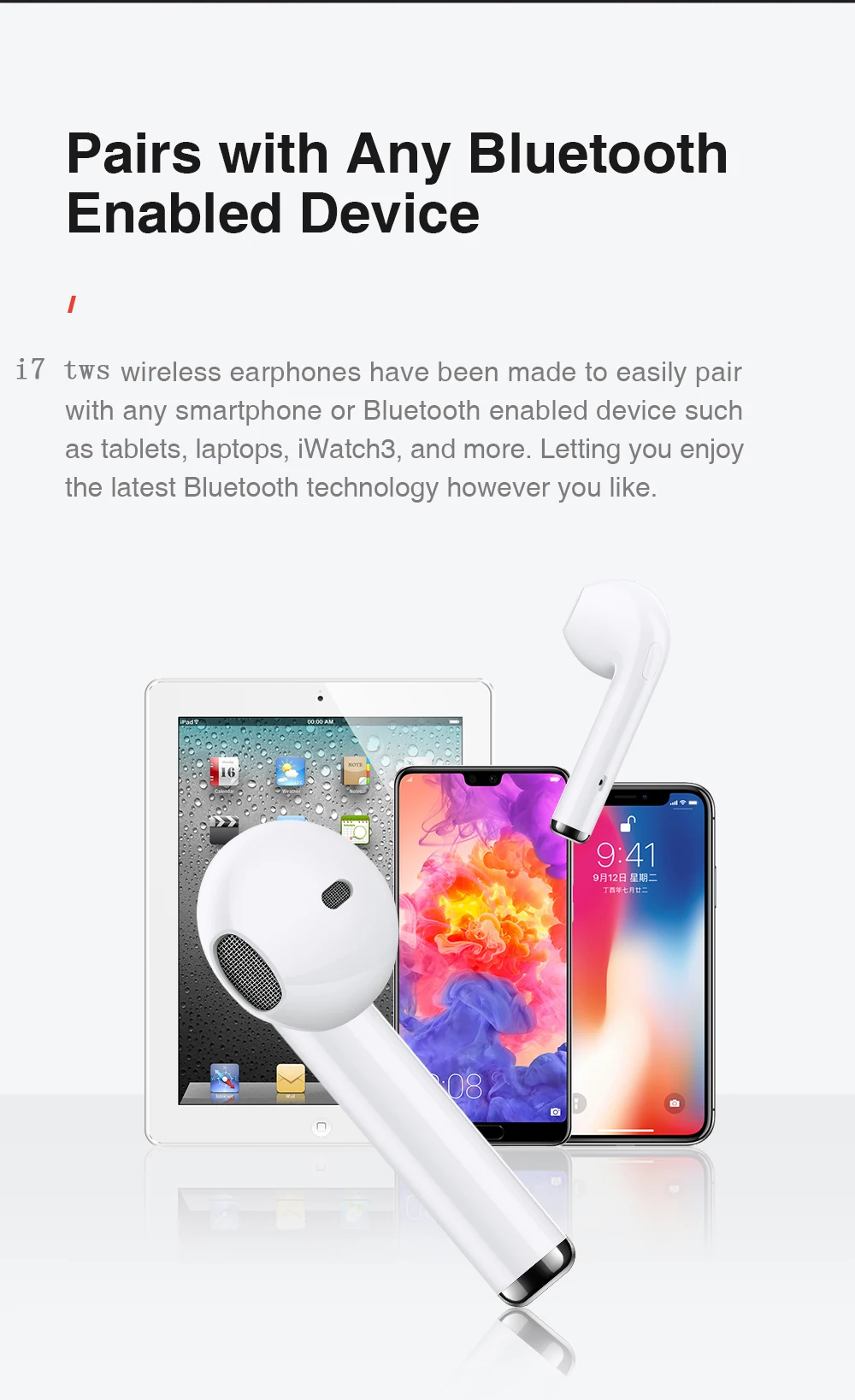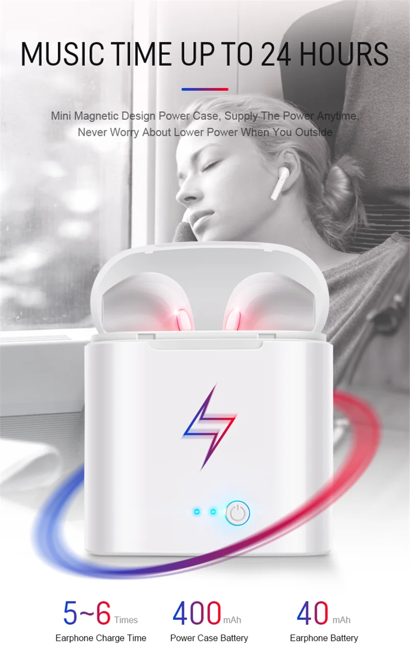 i7s tws wireless earphones have been made to easily pair with any smartphone or Bluetooth enabled device such as tablets, laptops, iWatch3, and more. Letting you enjoy the latest Bluetooth technology however you like.