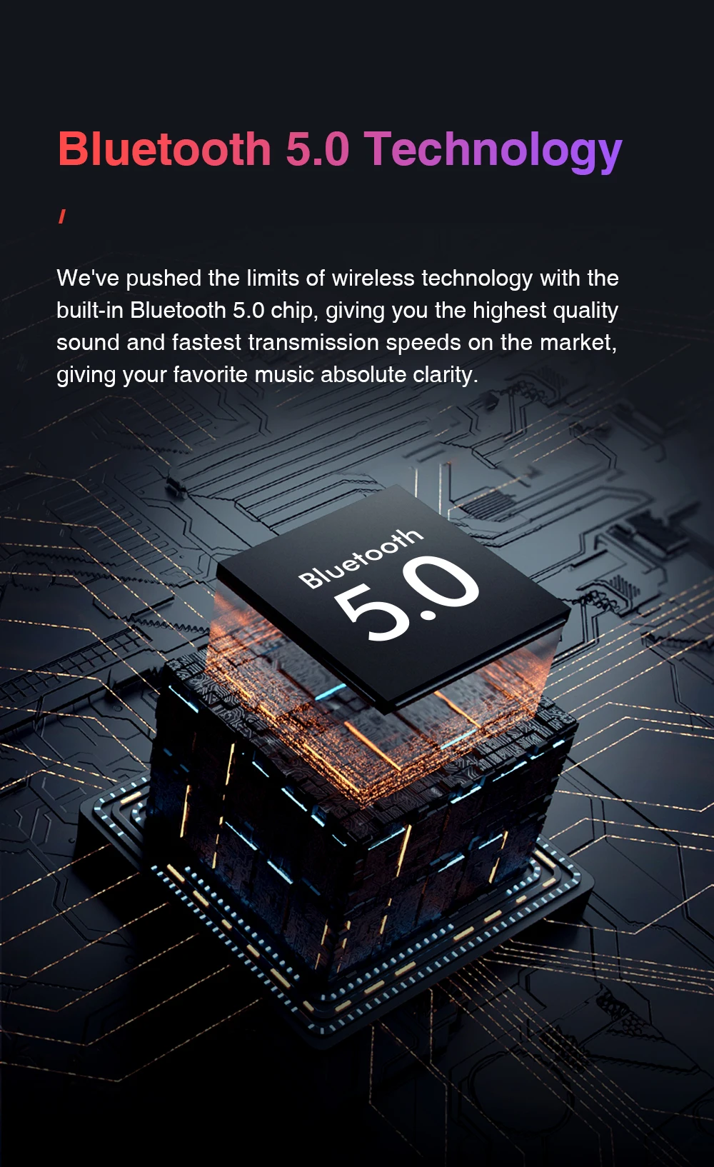 We’ve pushed the limits of wireless technology with the built-in Bluetooth 5.0 chip, giving you the highest quality sound and fastest transmission speeds on the market, giving your favorite music absolute clarity.